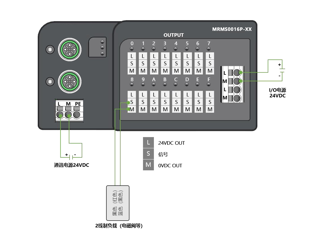 面板式快接线分布式I/O,EtherCAT通讯,2xM12,可级联;数字量16出 PNP,24VDC,0.5A,欧式弹簧端子;导轨安装&打孔安装(下单时需备注)