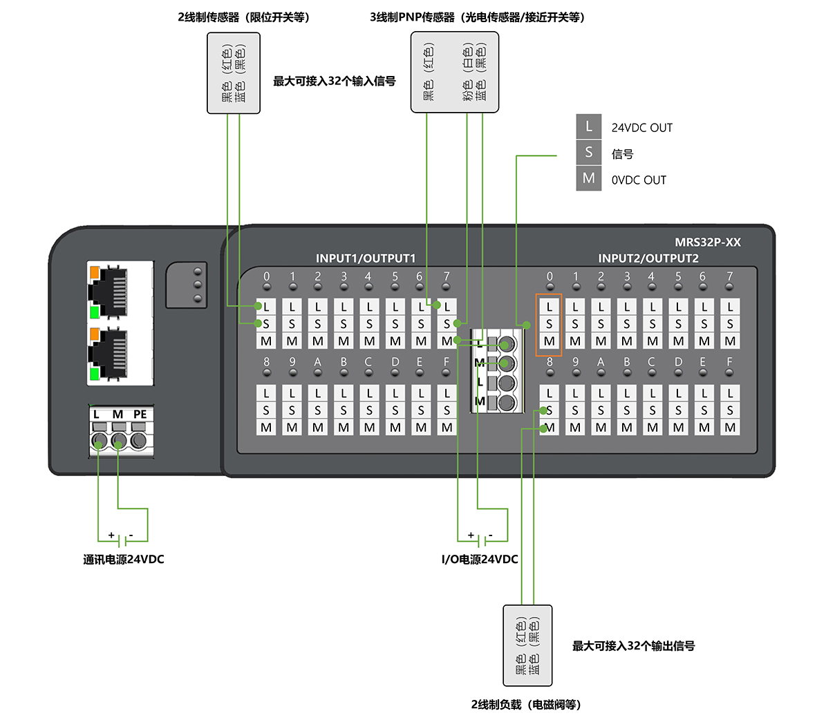 面板式快接线分布式I/O,PROFINET通讯,2xRJ45,可级联;PNP,32xDI/DO自适应,24VDC,单通道最大输出0.5A,欧式弹簧端子;导轨安装&打孔安装(下单时需备注)