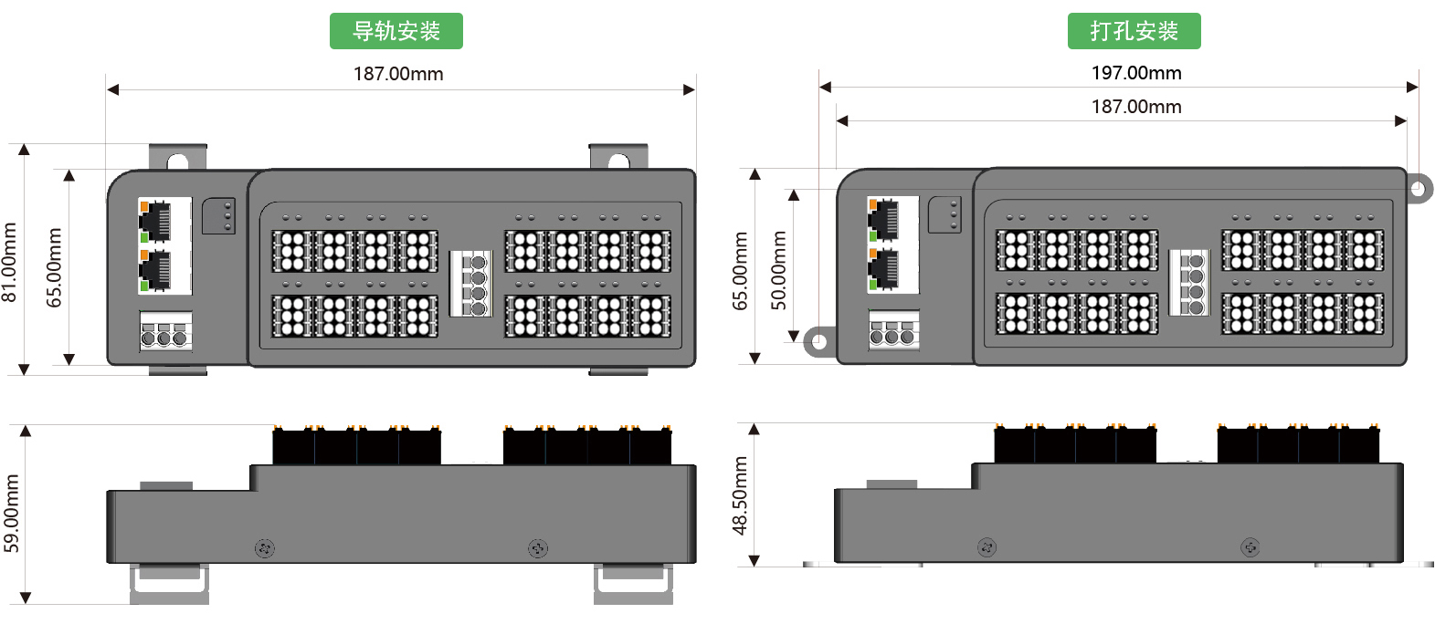 安装方式:DIN35导轨安装或双侧耳打孔安装
