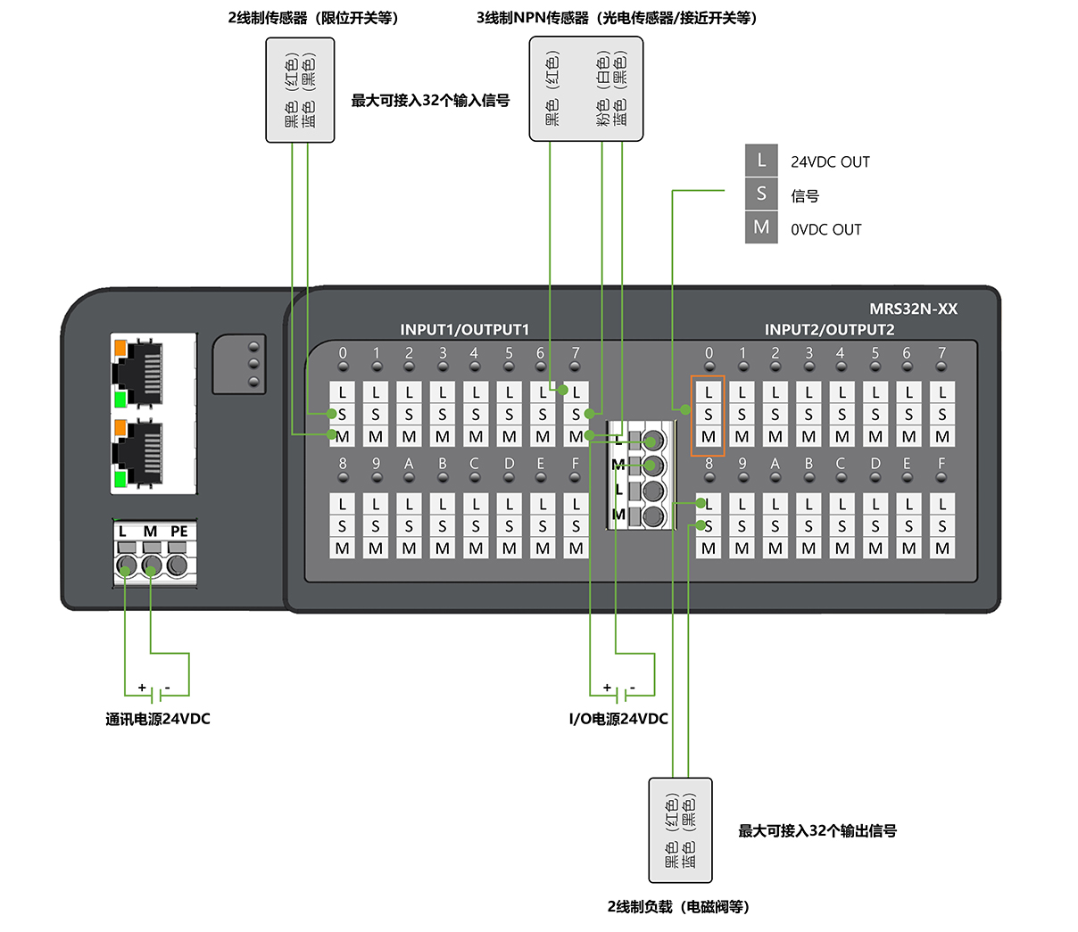 面板式快接线分布式I/O,PROFINET通讯,2xRJ45,可级联;NPN,32xDI/DO自适应,24VDC,单通道最大输出0.5A,欧式弹簧端子;导轨安装&打孔安装(下单时需备注)