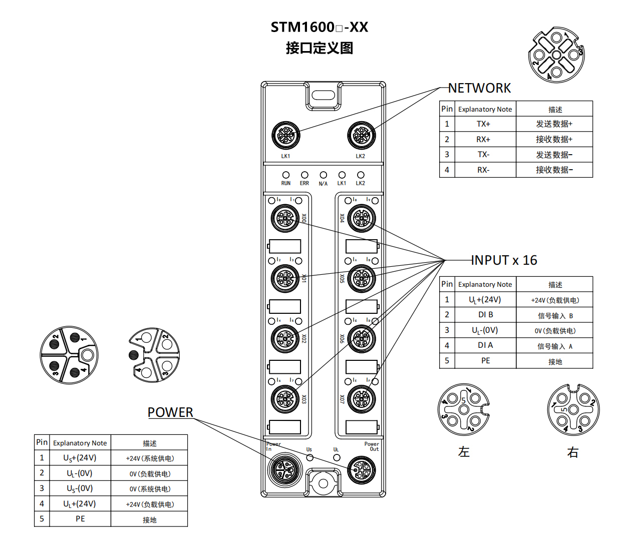 电源接口:Power In:1×M12,L-Code,4P针;Power Out:1×M12,L-Code,4P孔(最大电流16A)